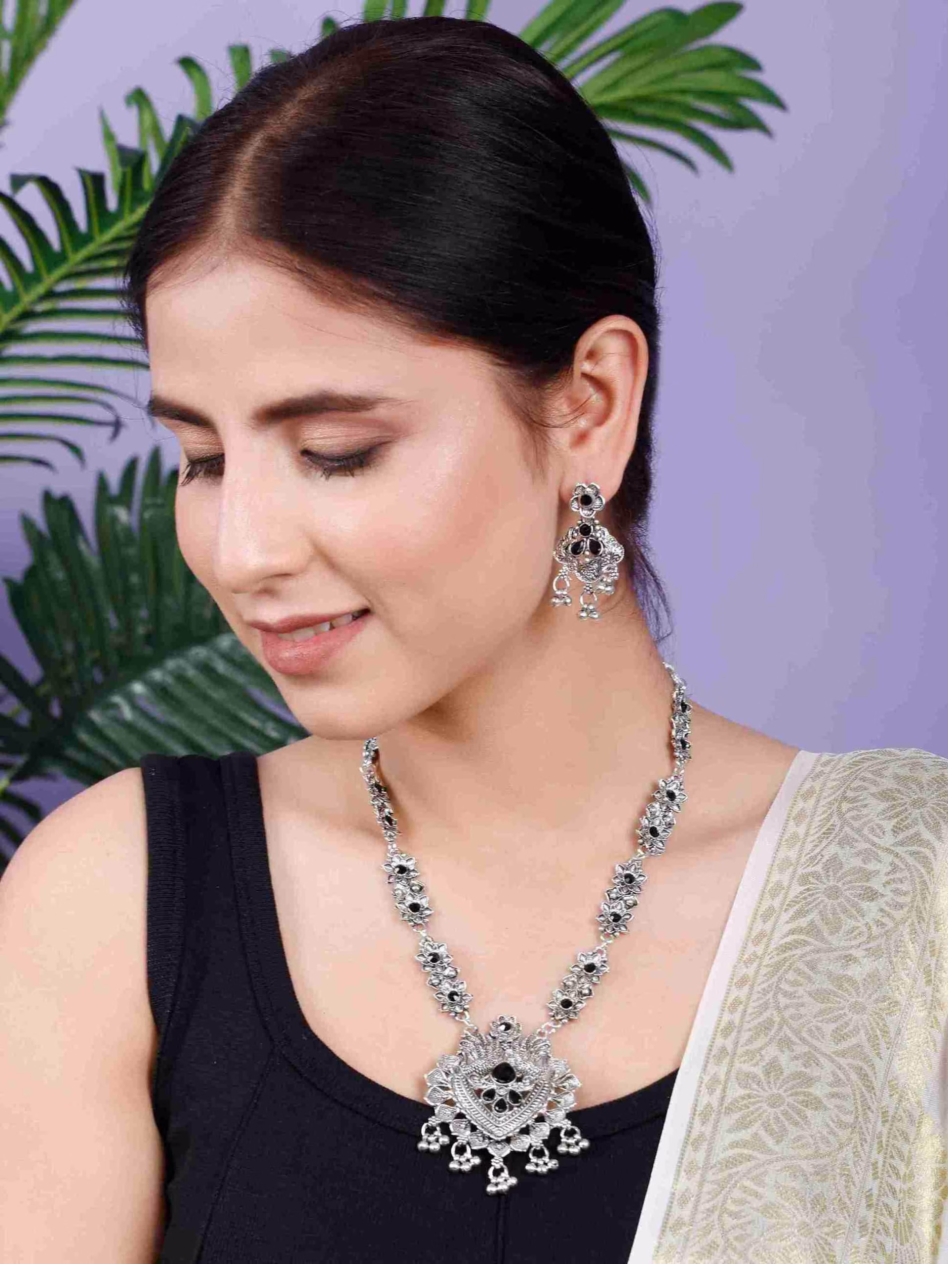 Pair this Long Flower Peacock Necklace Set with a silk saree or embroidered lehenga to create a royal, eye-catching look that stands out at every celebration.